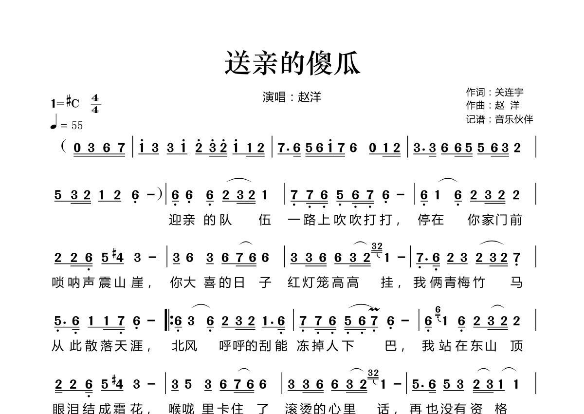 曲谱介绍: 赵洋《送亲的傻瓜》,音乐伙伴编配出品,共有2张高清图谱,免翻页排版设计。