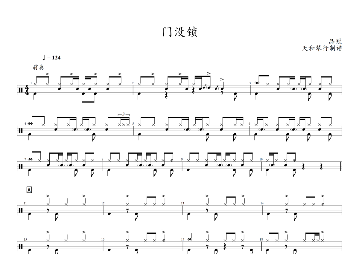 曲谱介绍: 品冠《门没锁》架子鼓谱,音符喷血者编配出品,共有3张高清图谱。