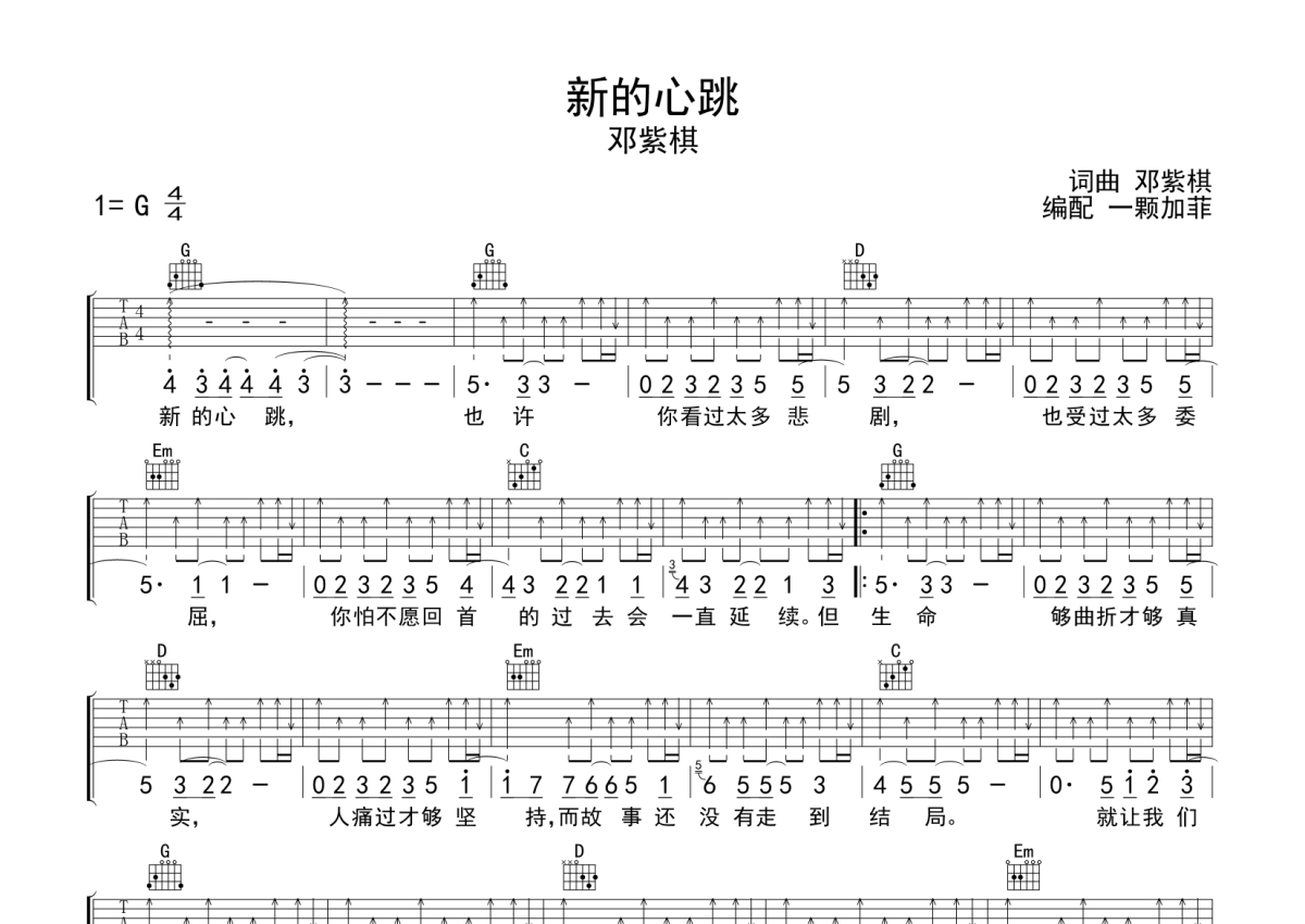 曲谱介绍: 邓紫棋《新的心跳》吉他弹唱谱,采用G调指法编配,一颗加菲编配出品,共有2张高清图谱,免翻页排版设计。