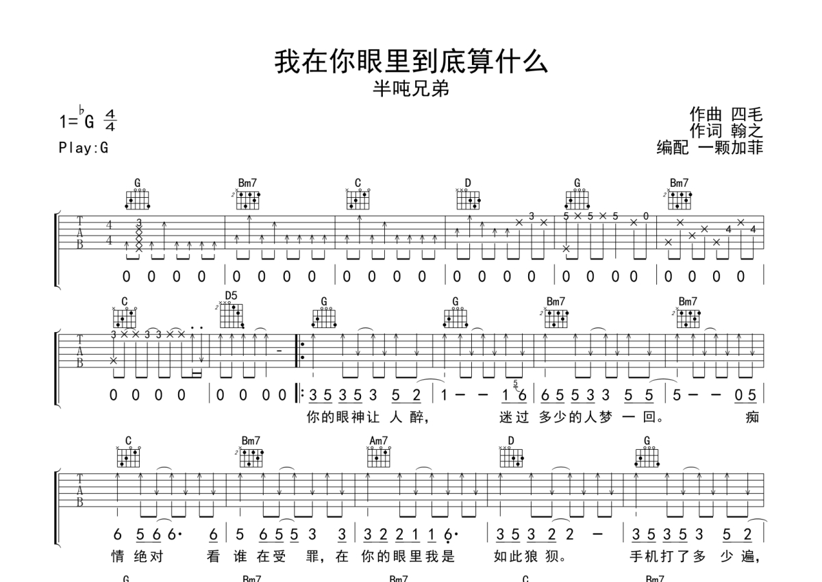 曲谱介绍: 半吨兄弟《我在你眼里到底算什么》吉他弹唱谱,采用G调指法编配,一颗加菲编配出品,共有2张高清图谱,免翻页排版设计。
