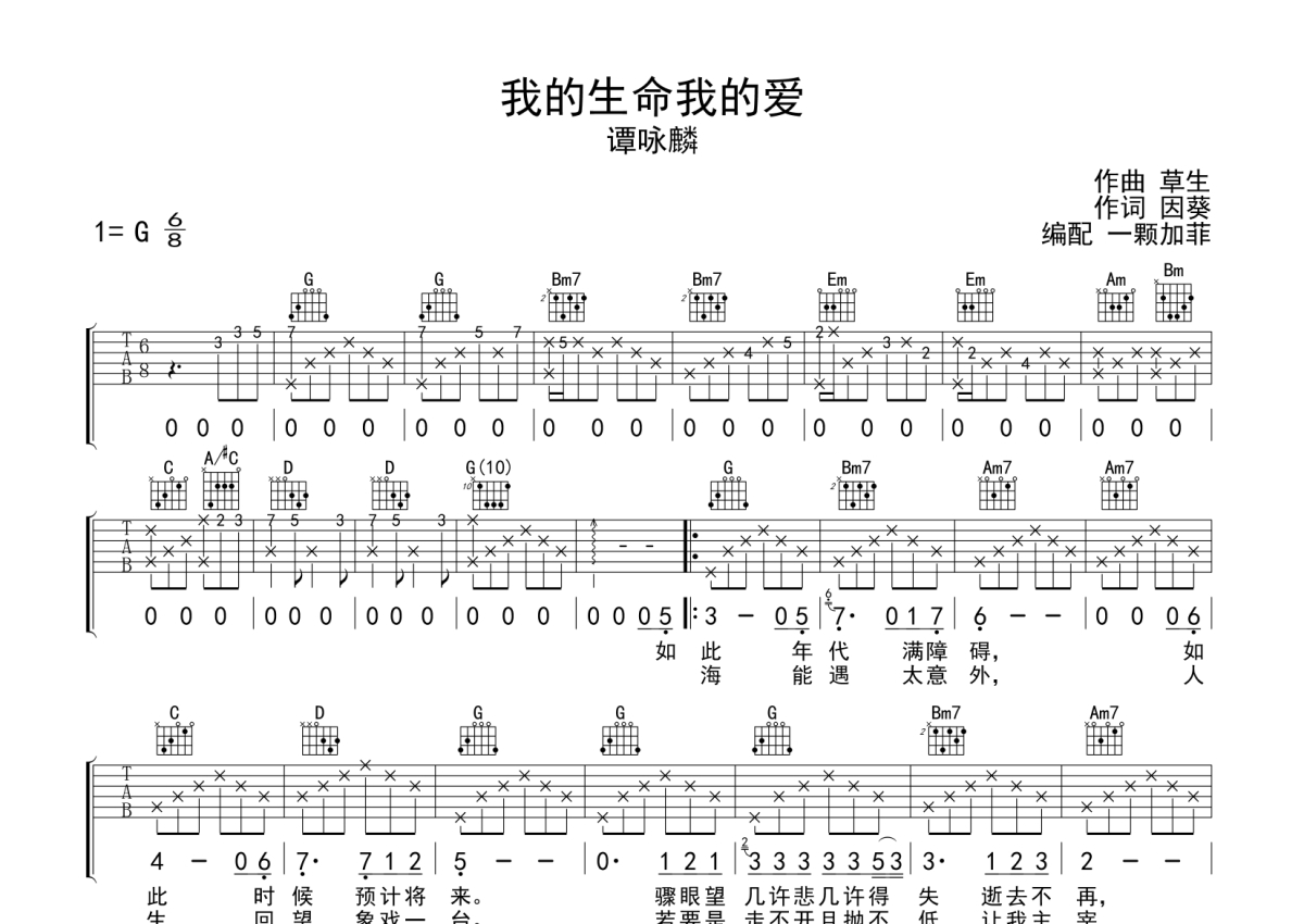 曲谱介绍: 谭咏麟《我的生命我的爱》吉他弹唱谱,采用G调指法编配,一颗加菲编配出品,共有2张高清图谱,免翻页排版设计。