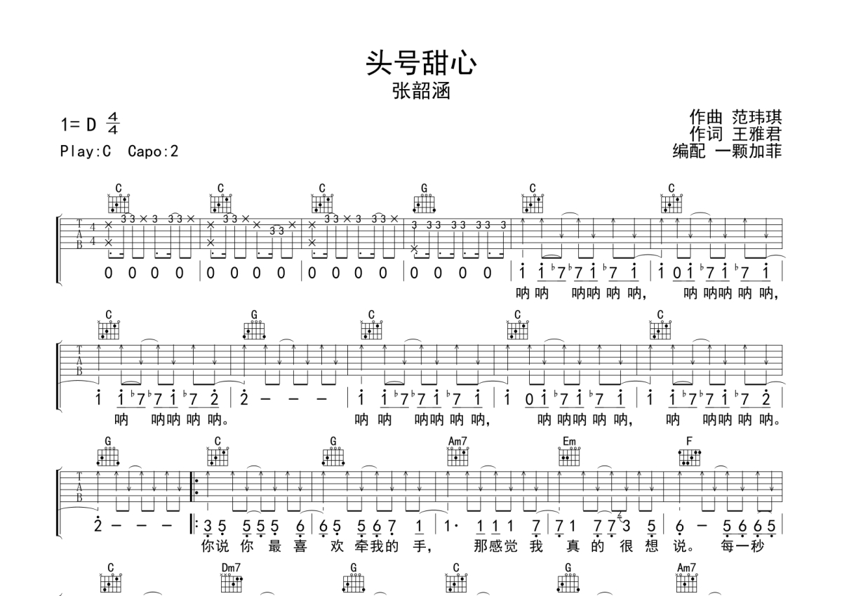 曲谱介绍: 张韶涵《头号甜心》吉他弹唱谱,采用C调指法编配,一颗加菲编配出品,共有2张高清图谱,免翻页排版设计。