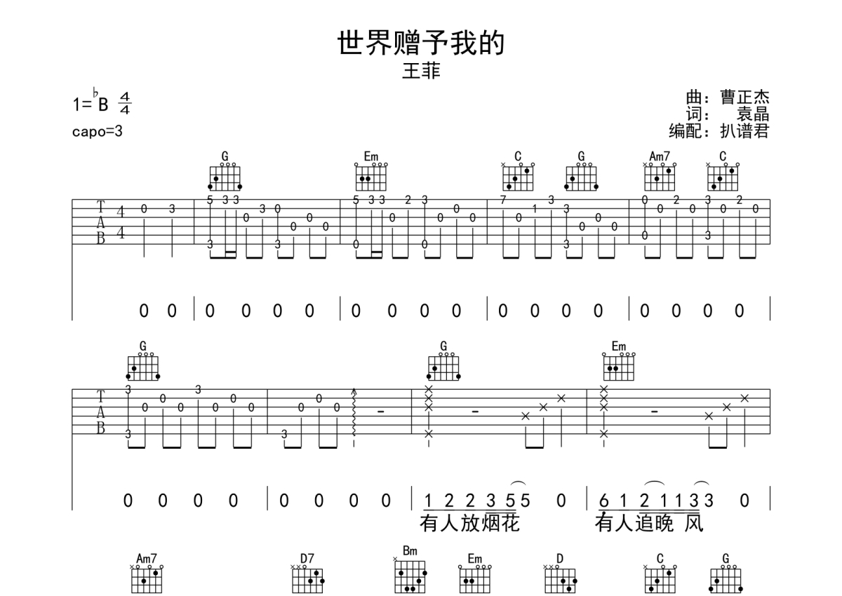 曲谱介绍: 王菲《世界赠予我的》吉他弹唱谱,扒谱君编配出品,共有4张高清图谱。
