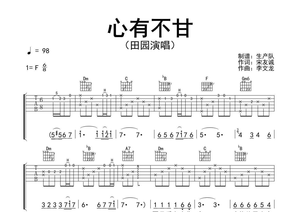 曲谱介绍: 田园《心有不甘》吉他弹唱谱,采用F调指法编配精编完美版,生产队编配出品,共有3张高清图谱。