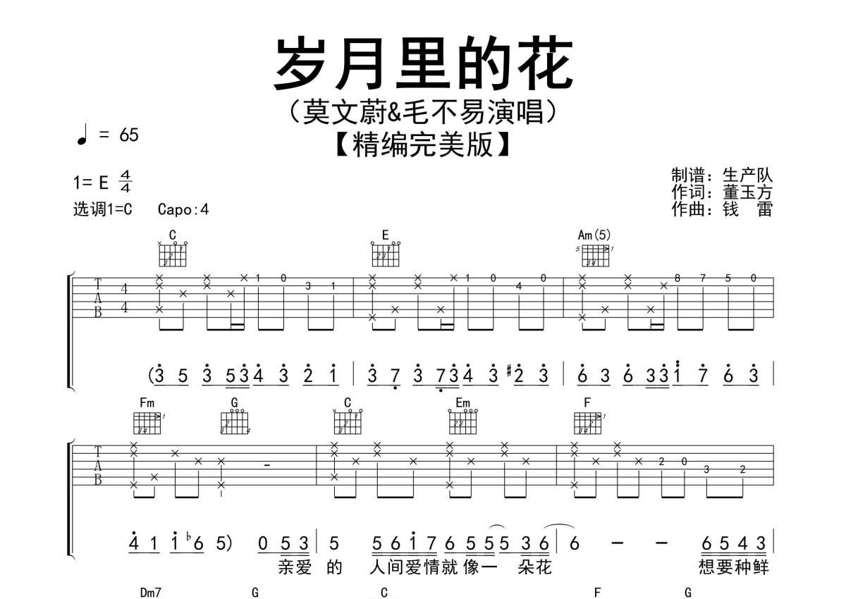 曲谱介绍: 莫文蔚&毛不易《岁月里的花》吉他弹唱谱,采用C调指法编配精编完美版,生产队编配出品,共有3张高清图谱。