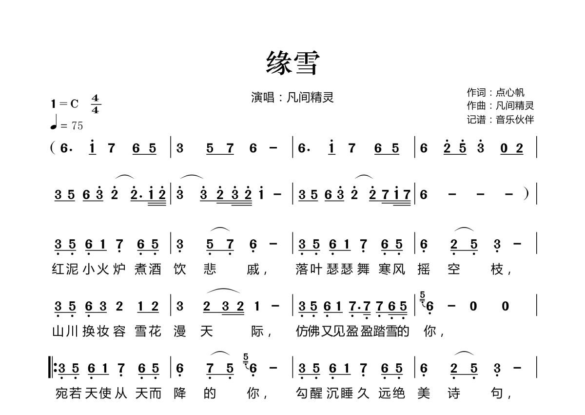曲谱介绍: 凡间精灵《缘雪》,音乐伙伴编配出品,共有2张高清图谱,免翻页排版设计。