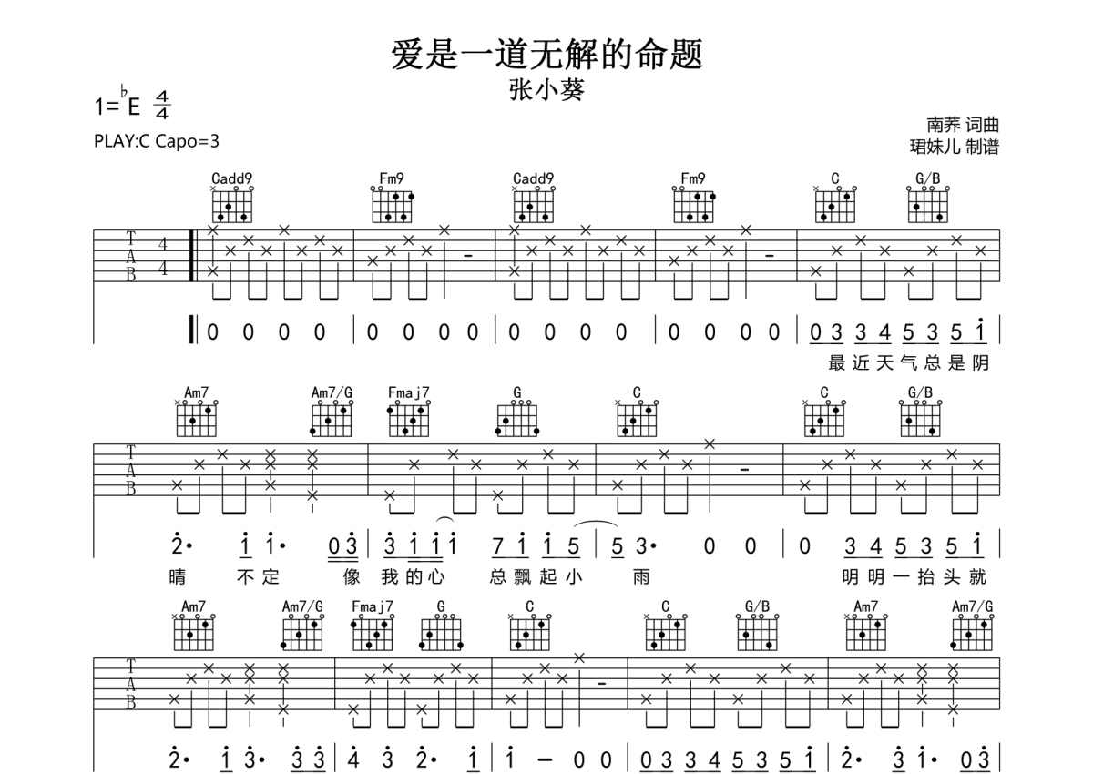 • 爱是一道无解的命题吉他谱 - 张小葵 - C调吉他弹唱谱第1张