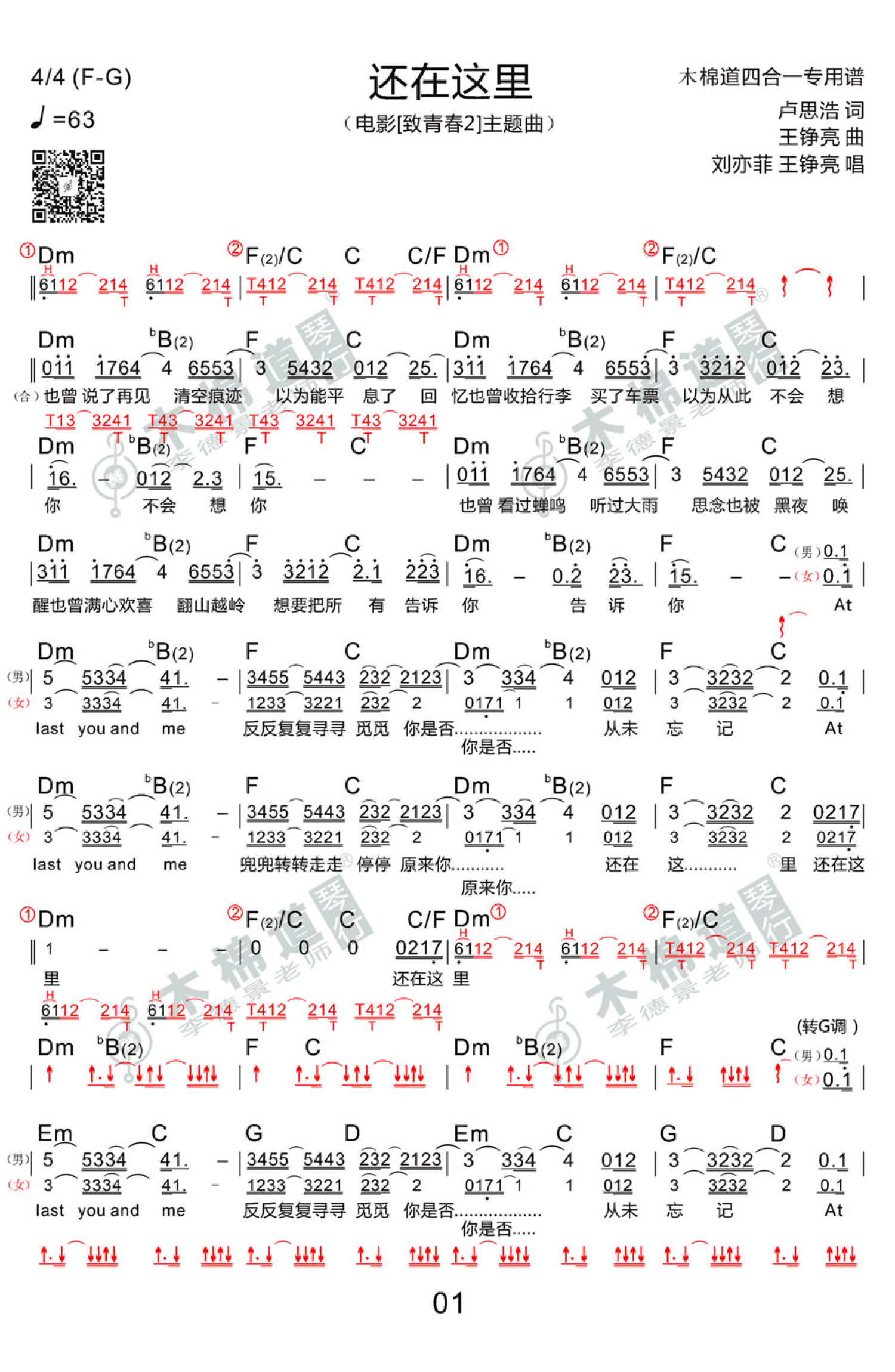 曲谱介绍: 还在这里吉他谱,电影《致青春•原来你还在这里》主题曲,刘亦菲王铮亮男女生对唱歌曲,曲风唯美浪漫,王铮亮磁性低沉的嗓音搭配刘亦菲细腻柔美的声线,令人心动。