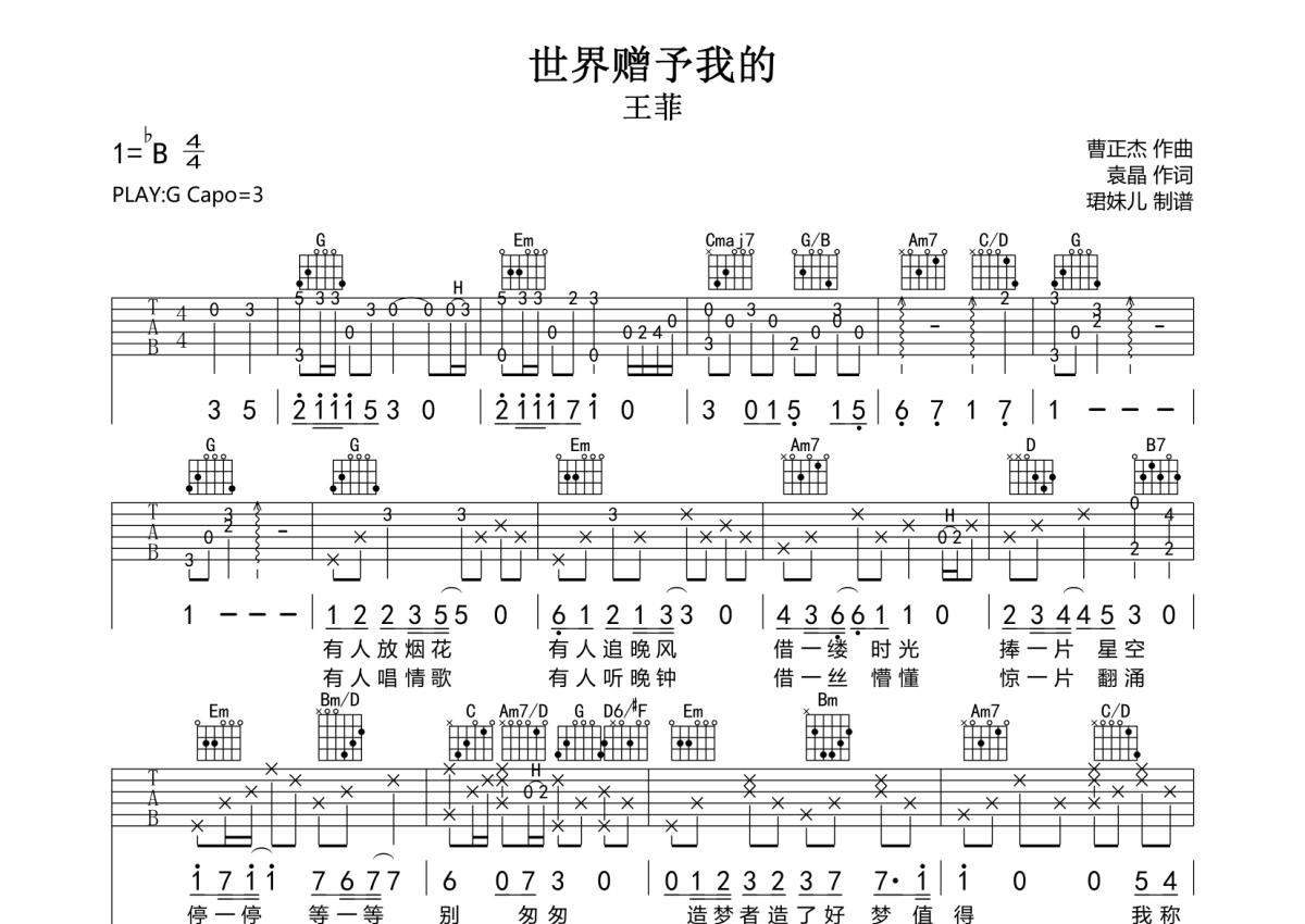 曲谱介绍: 王菲《世界赠予我的》吉他弹唱谱,采用G调指法编配,珺妹儿编配出品,共有2张高清图谱,免翻页排版设计。