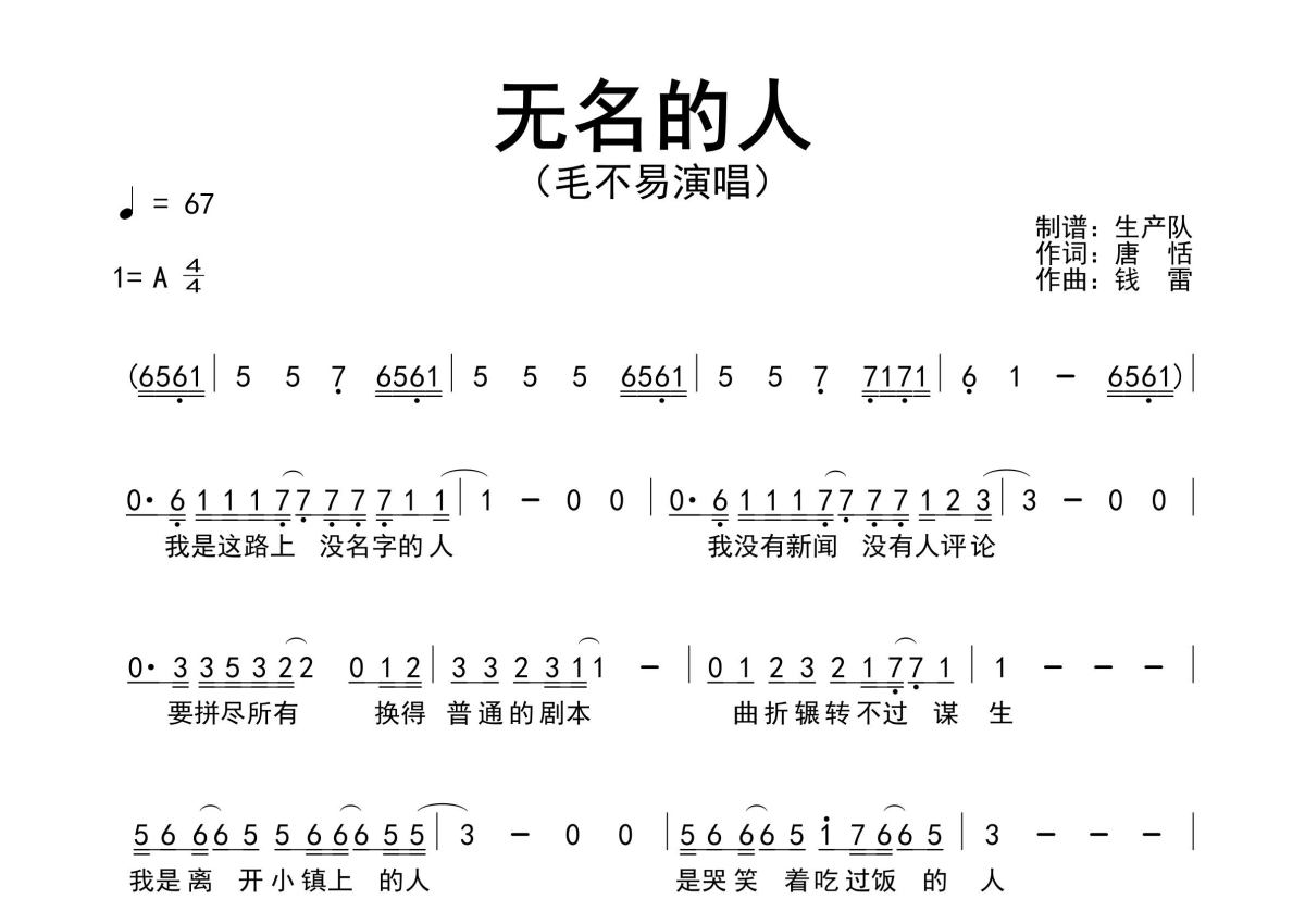 曲谱介绍: 毛不易《无名的人》原版简谱,生产队编配出品,共有2张高清图谱,免翻页排版设计。