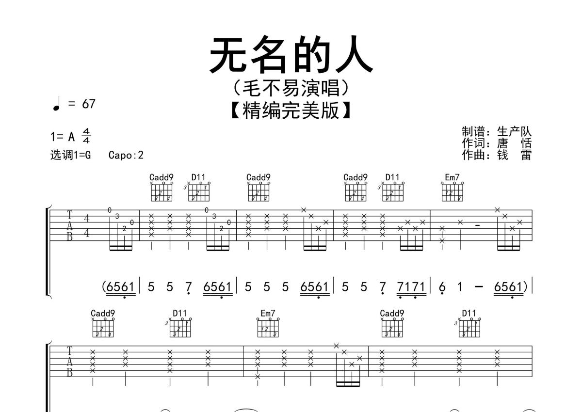 曲谱介绍: 毛不易《无名的人》吉他弹唱谱,采用G调指法编配精编完美版,生产队编配出品,共有5张高清图谱。