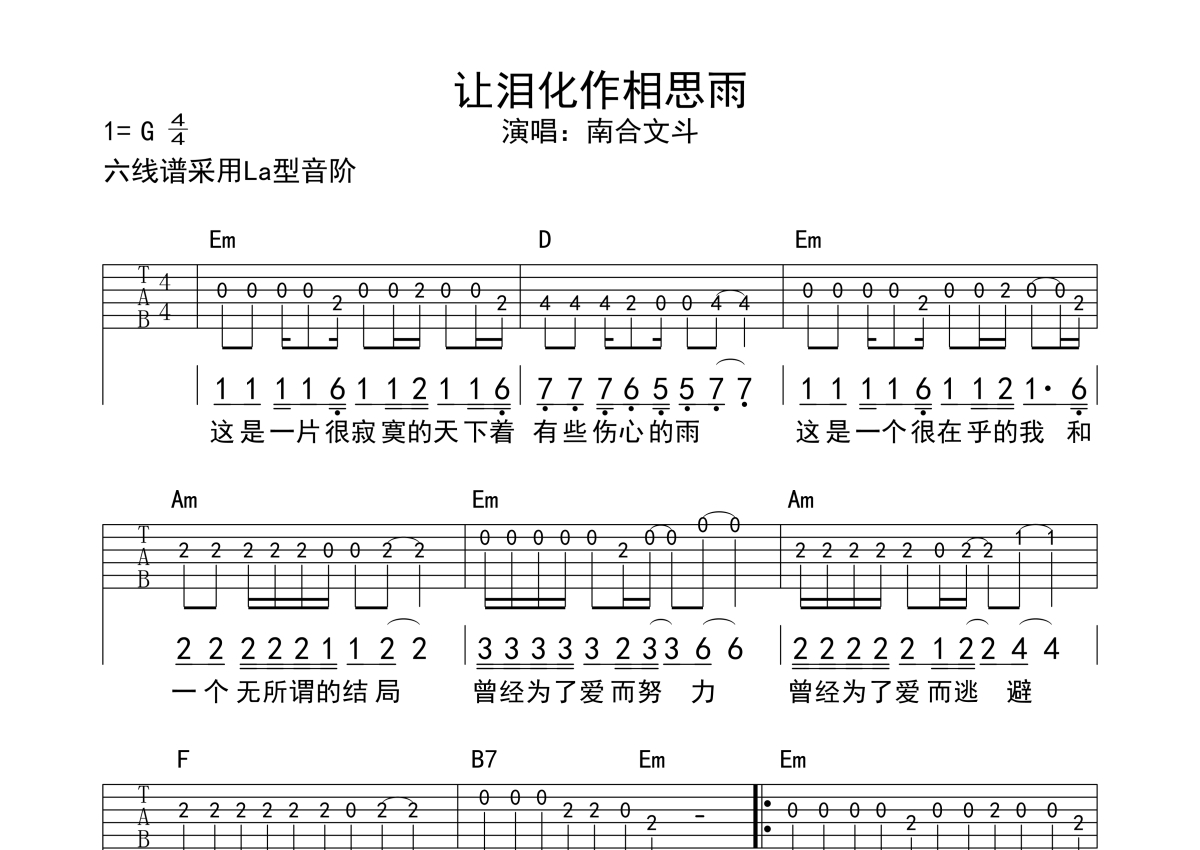 曲谱介绍: 南合文斗《让泪化作相思雨》吉他弹唱谱,采用C调指法编配,觅火单音谱编配出品,共有2张高清图谱,免翻页排版设计。