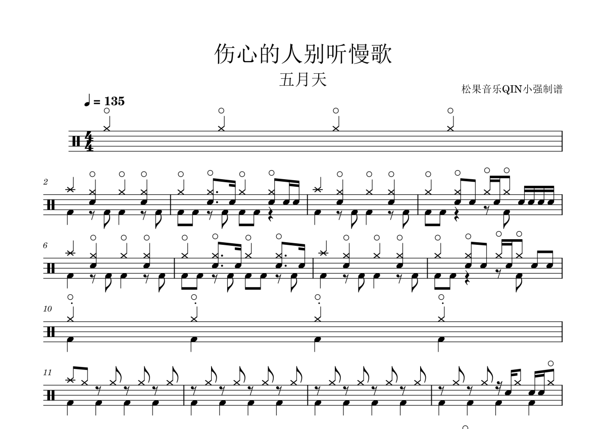 曲谱介绍: 贯彻快乐《伤心的人别听慢歌(贯彻快乐)》架子鼓谱,松果音乐QIN小强编配出品,共有3张高清图谱。