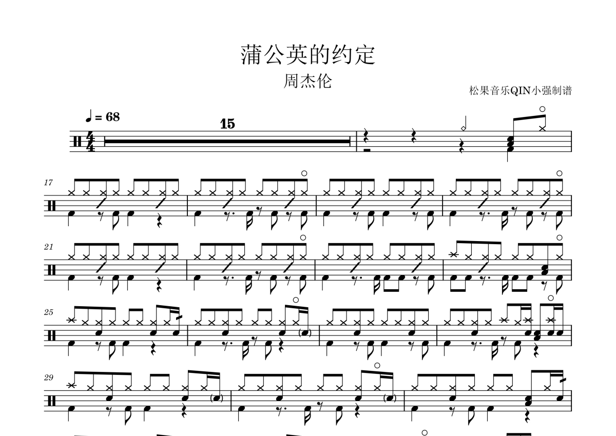 曲谱介绍: 周杰伦《蒲公英的约定》架子鼓谱,松果音乐QIN小强编配出品,共有2张高清图谱,免翻页排版设计。