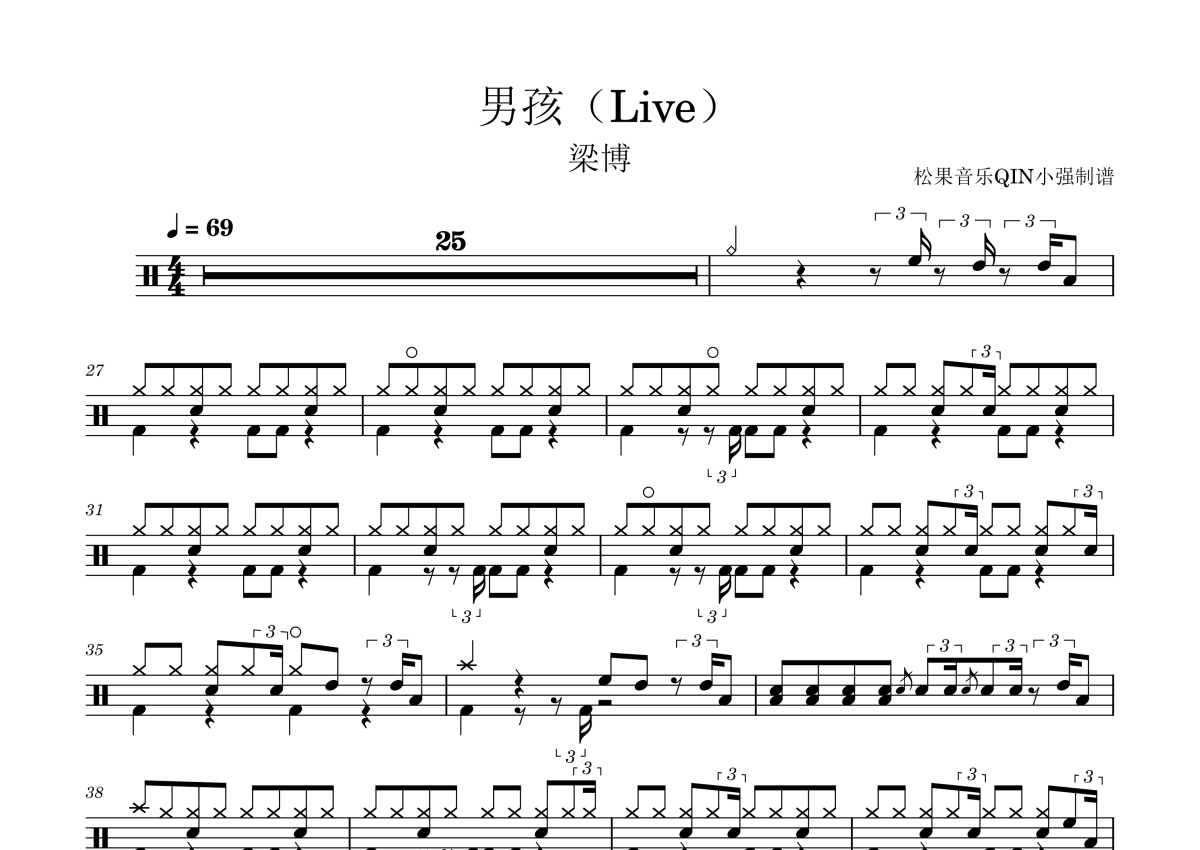 曲谱介绍: Live《男孩(Live)》架子鼓谱,松果音乐QIN小强编配出品,共有2张高清图谱,免翻页排版设计。
