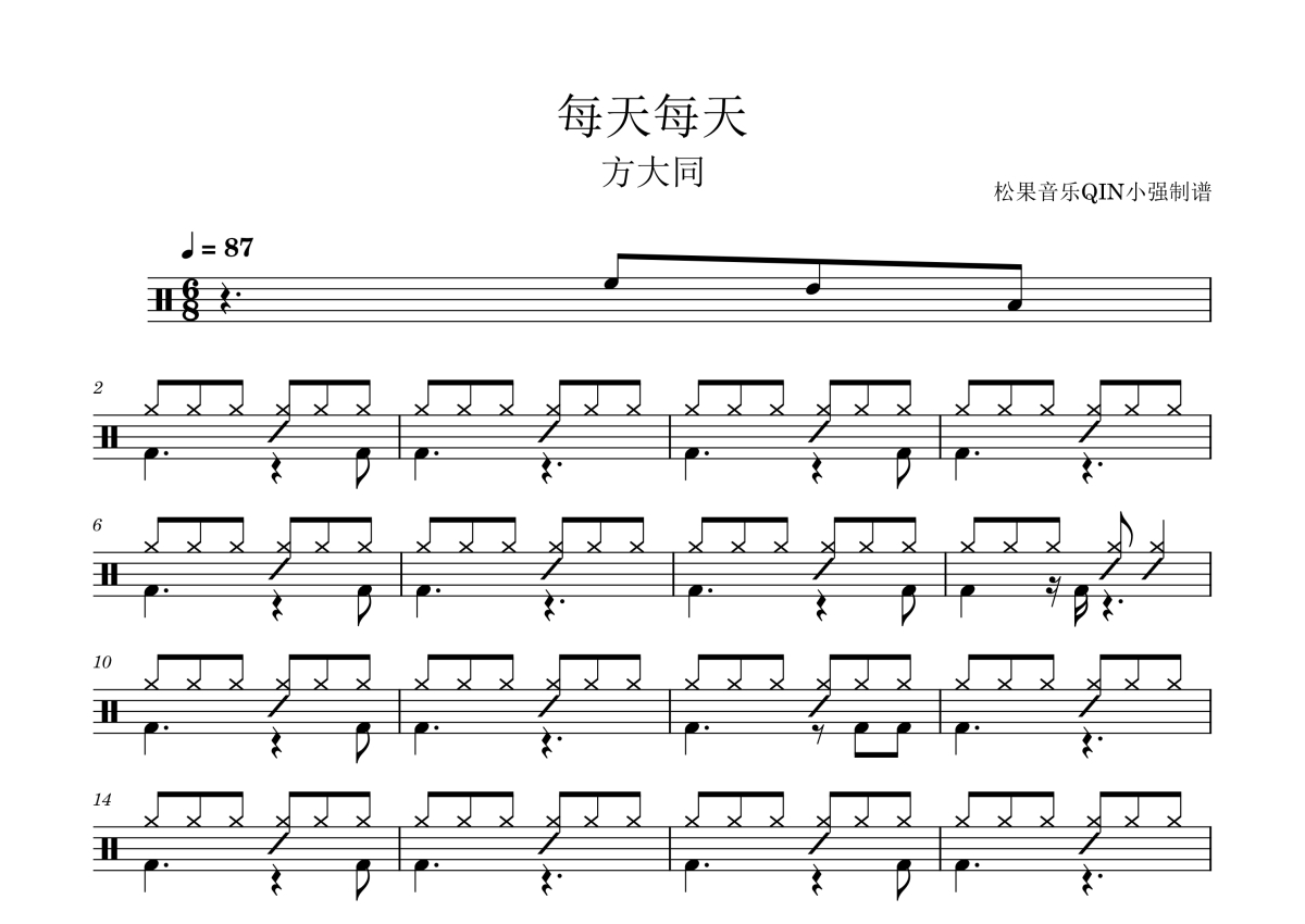 曲谱介绍: 方大同《每天每天》架子鼓谱,松果音乐QIN小强编配出品,共有3张高清图谱。