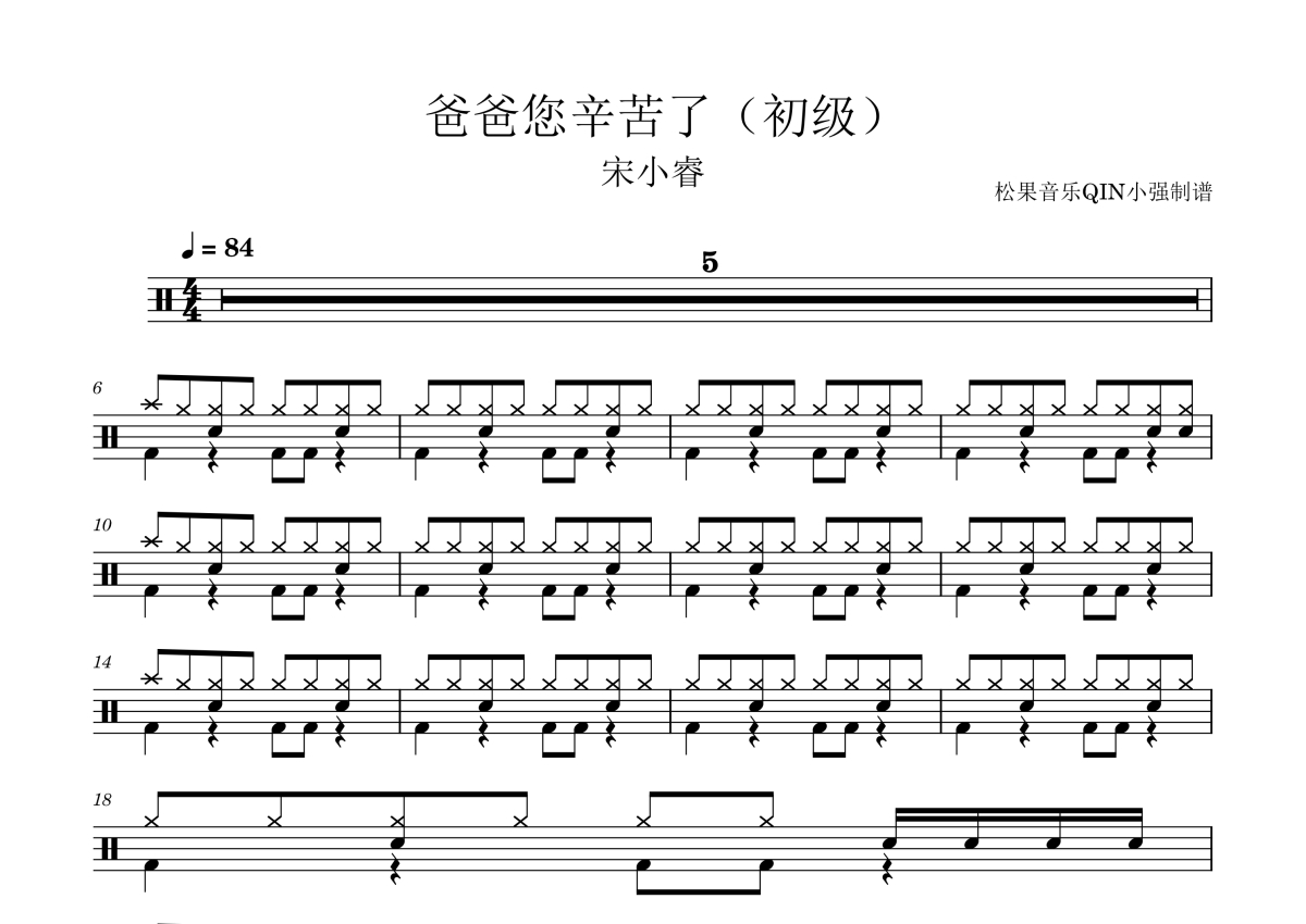 曲谱介绍: 初级《爸爸您辛苦了(初级)》架子鼓谱,松果音乐QIN小强编配出品,共有2张高清图谱,免翻页排版设计。