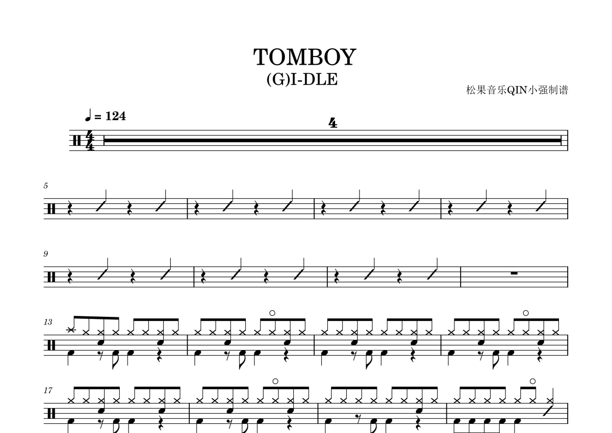 曲谱介绍: (G)I-DLE《TOMBOY》架子鼓谱,松果音乐QIN小强编配出品,共有3张高清图谱。