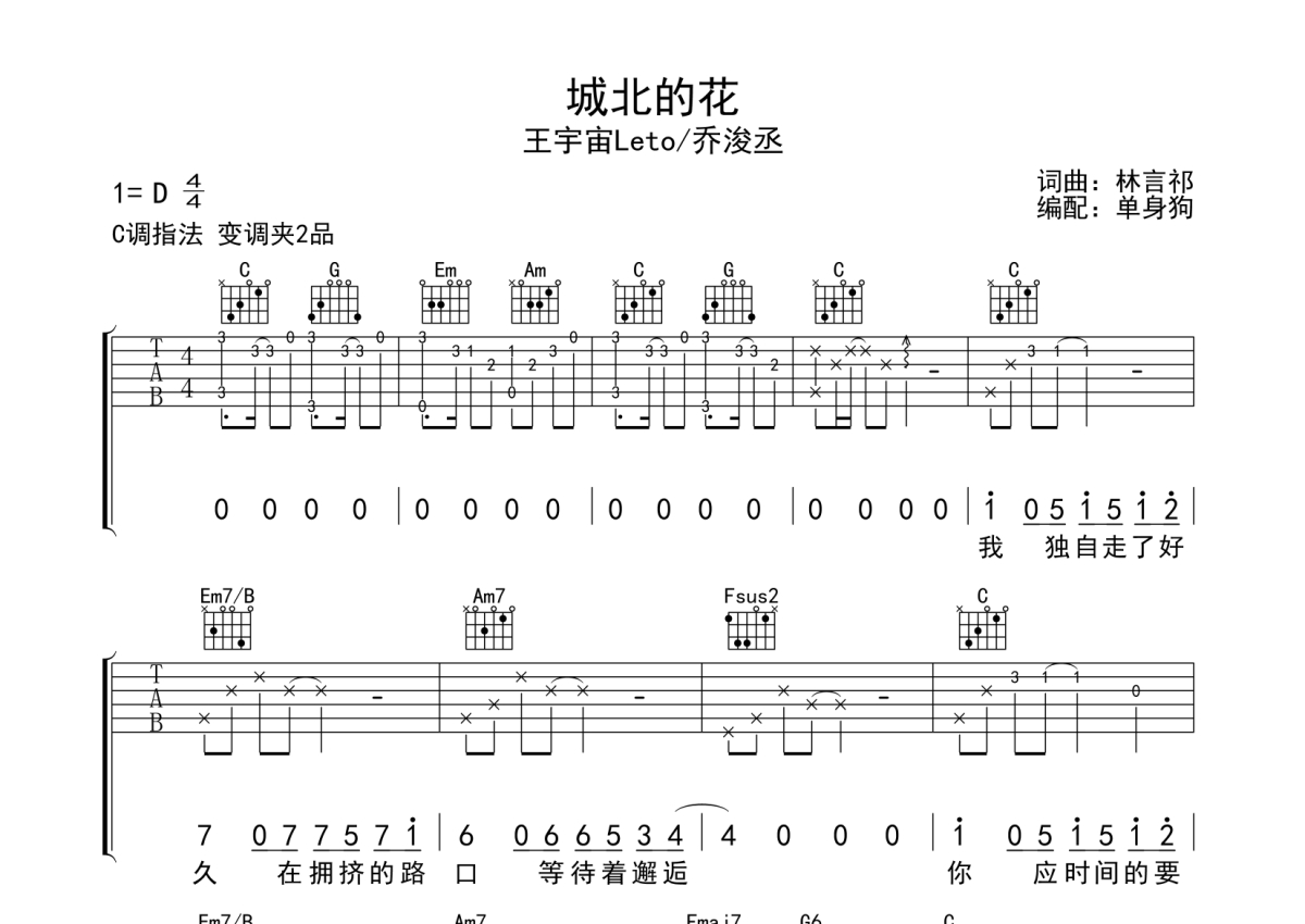 曲谱介绍: 王宇宙Leto/乔浚丞《城北的花》吉他弹唱谱,采用C调指法编配,单身狗编配出品,共有3张高清图谱。