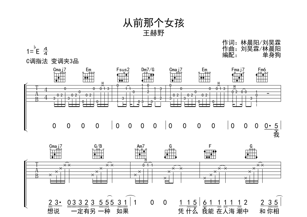 曲谱介绍: 王赫野《从前那个女孩》吉他弹唱谱,采用C调指法编配,单身狗编配出品,共有3张高清图谱。