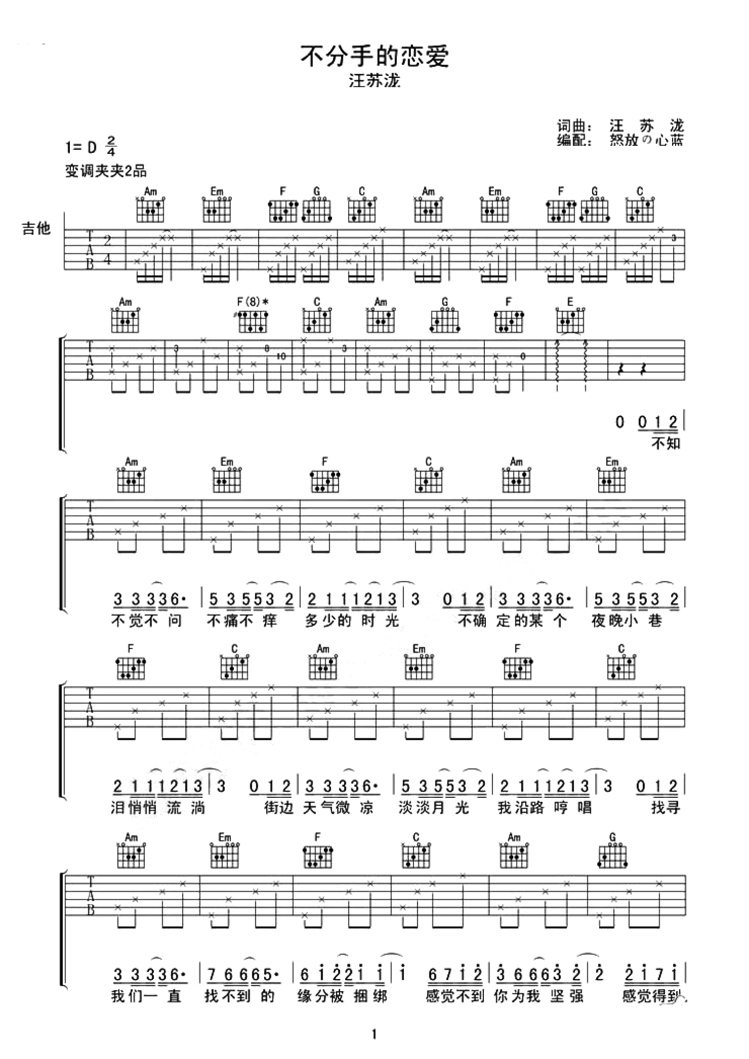 不分手的恋爱吉他谱 - 汪苏泷 - D调吉他弹唱谱