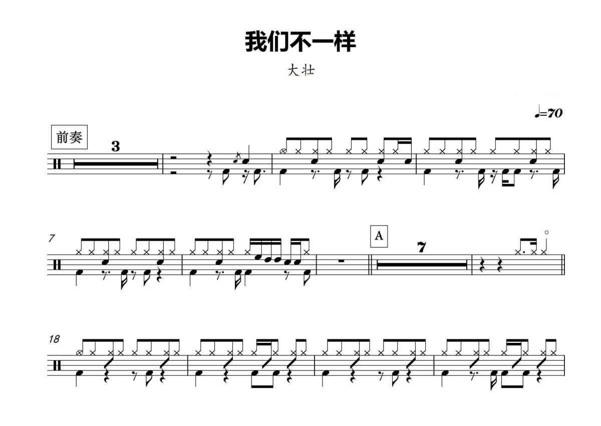 曲谱介绍: 大壮《我们不一样》架子鼓谱,音符喷血者编配出品,共有3张高清图谱。