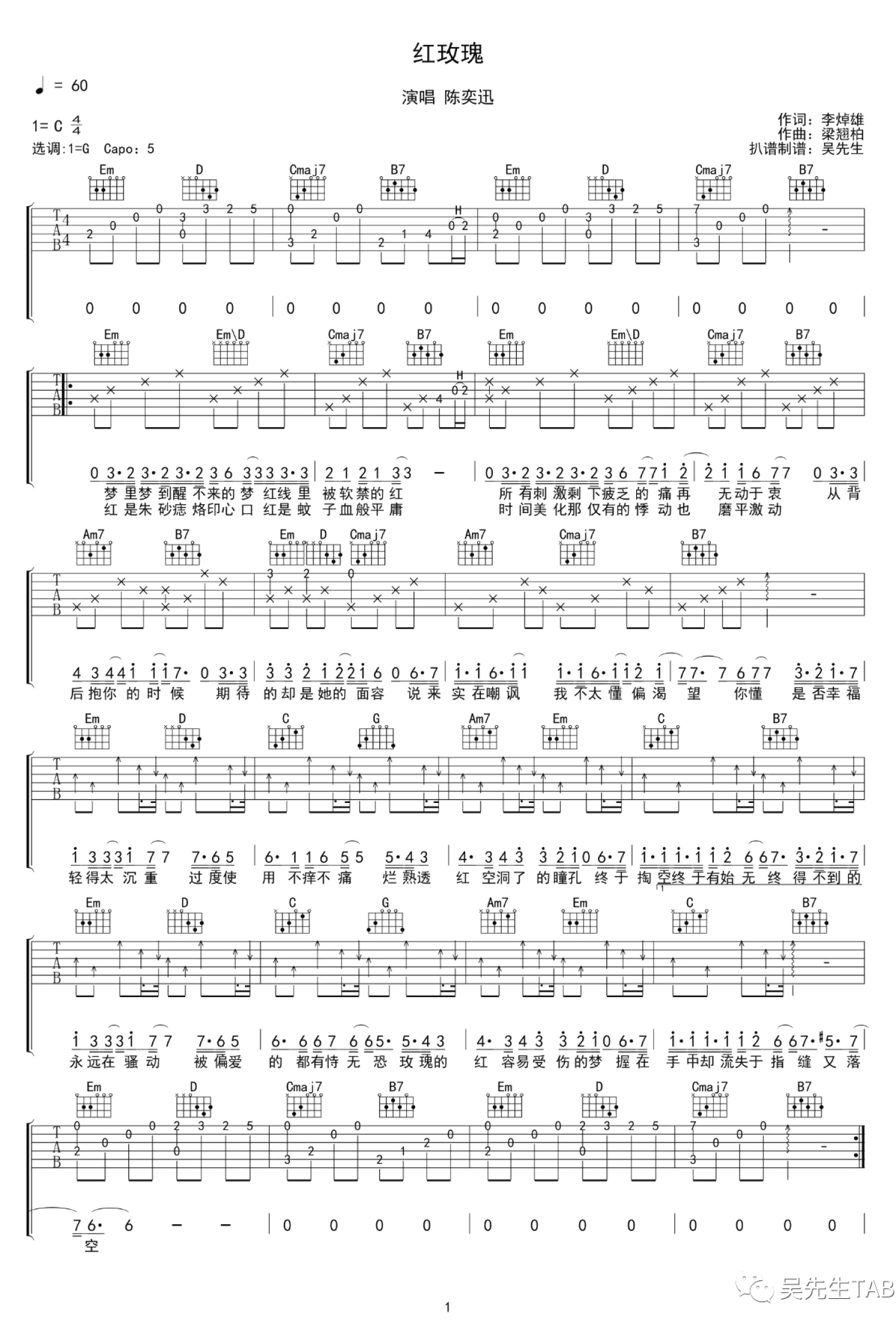 曲谱介绍: 红玫瑰吉他谱,陈奕迅的一首代表歌曲,唱出爱情里的得到和失去。红玫瑰六线谱,原调C,选调G,CAPO夹五品。你可能没看过张爱玲的那本小说,想必却一定听过Eason的《红玫瑰》。得不到的永远在骚动,被偏爱的都有恃无恐,也正是因为这句经典歌词,让它的传唱度远比粤语版本的《白玫瑰》 来的更广。