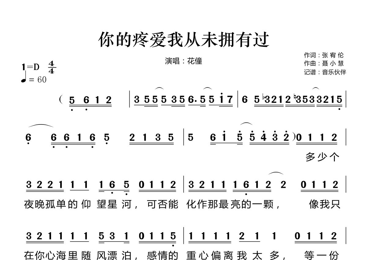 曲谱介绍: 花僮《你的疼爱我从未拥有过》,音乐伙伴编配出品,共有2张高清图谱,免翻页排版设计。
