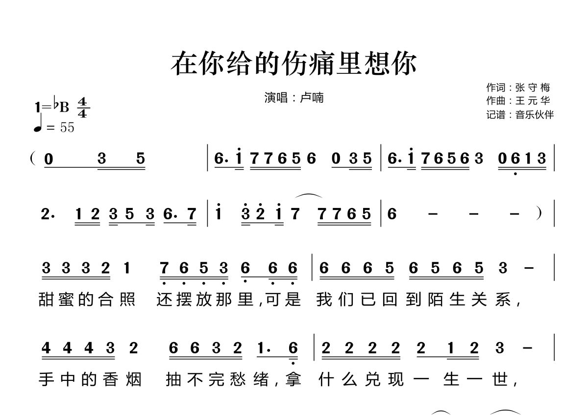 曲谱介绍: 卢喃《在你给的伤痛里想你》,音乐伙伴编配出品,共有2张高清图谱,免翻页排版设计。