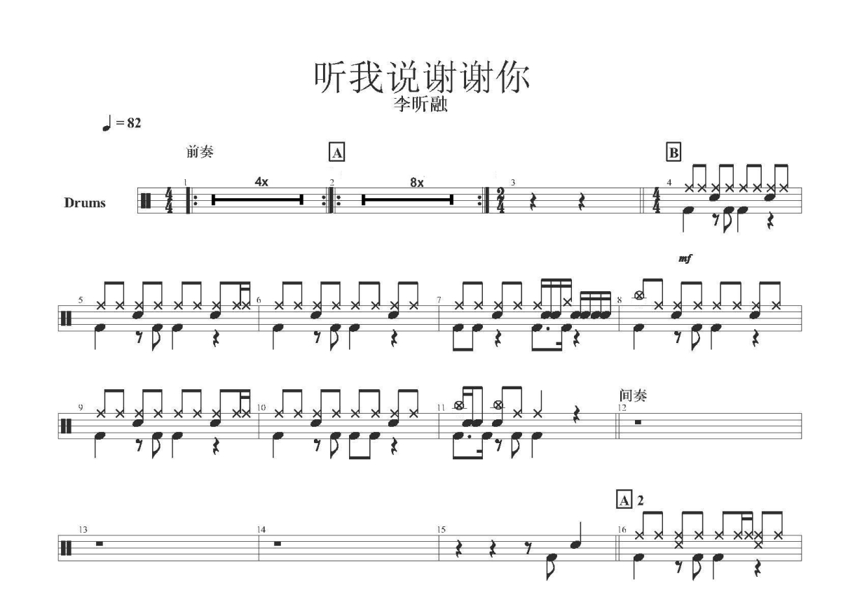 • 听我说谢谢你鼓谱 - 李昕融 - 架子鼓谱第1张