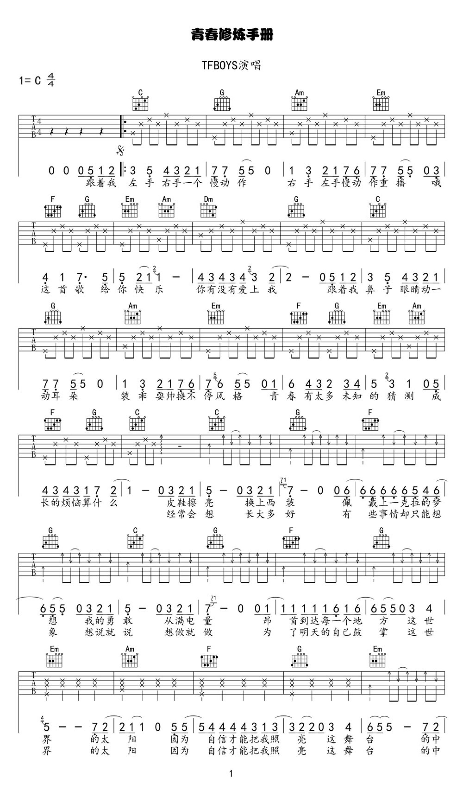 曲谱介绍: TFBOYS演唱的《青春修炼手册》吉他谱,C调弹唱谱高清版,青春修炼手册吉他六线谱,一首青春活力的歌曲,《青春修炼手册》,整首歌充满元气与活力,旋律灵动跳跃,歌词朗朗上口,青春的气息扑面而来,让你一下回到美好的青春时代。