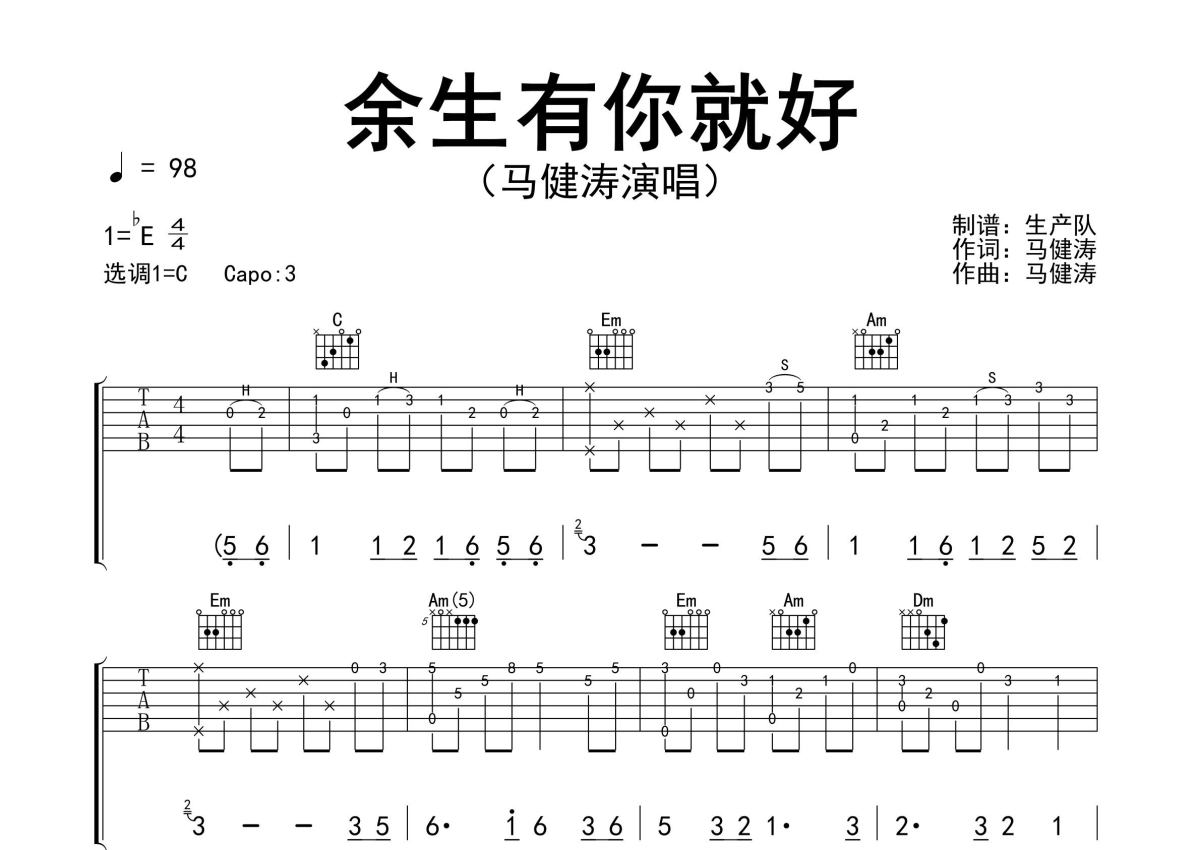 曲谱介绍: 马健涛《余生有你就好》吉他弹唱谱,采用C调指法编配精编完美版,生产队编配出品,共有3张高清图谱。