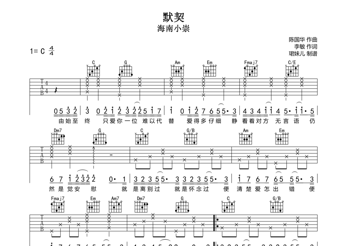 • 默契吉他谱 - 海南小崇 - C调吉他弹唱谱第1张