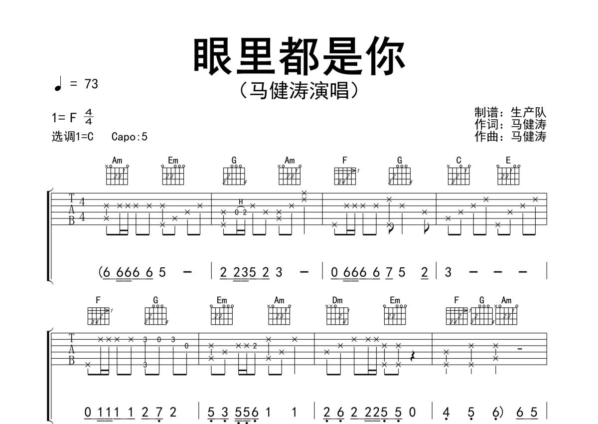 曲谱介绍: 马健涛《眼里都是你》吉他弹唱谱,采用G调指法编配精编完美版,生产队编配出品,共有3张高清图谱。