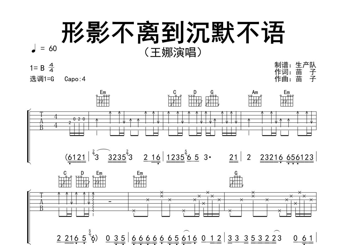 曲谱介绍: 王娜《形影不离到沉默不语》吉他弹唱谱,采用G调指法编配精编完美版,生产队编配出品,共有3张高清图谱。