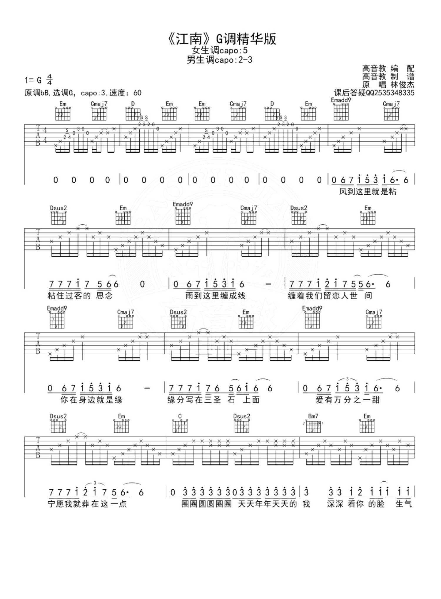 曲谱介绍: 江南吉他谱_林俊杰_《江南》G调原版弹唱六线谱_高清图片谱分享,《江南》这首歌由音乐才子林俊杰创作并演唱,也是林俊杰刚出道时的成名曲了,一首很有中国风味道的歌曲,曾一度不被看好,但结果已经说明了一切。 采用G调指法根据原版编配,歌曲原调为降B调,变调夹夹3品演唱,整首歌的节奏型几乎都是一样,由4个十六分音符组成一拍,练熟就成机械记忆了。