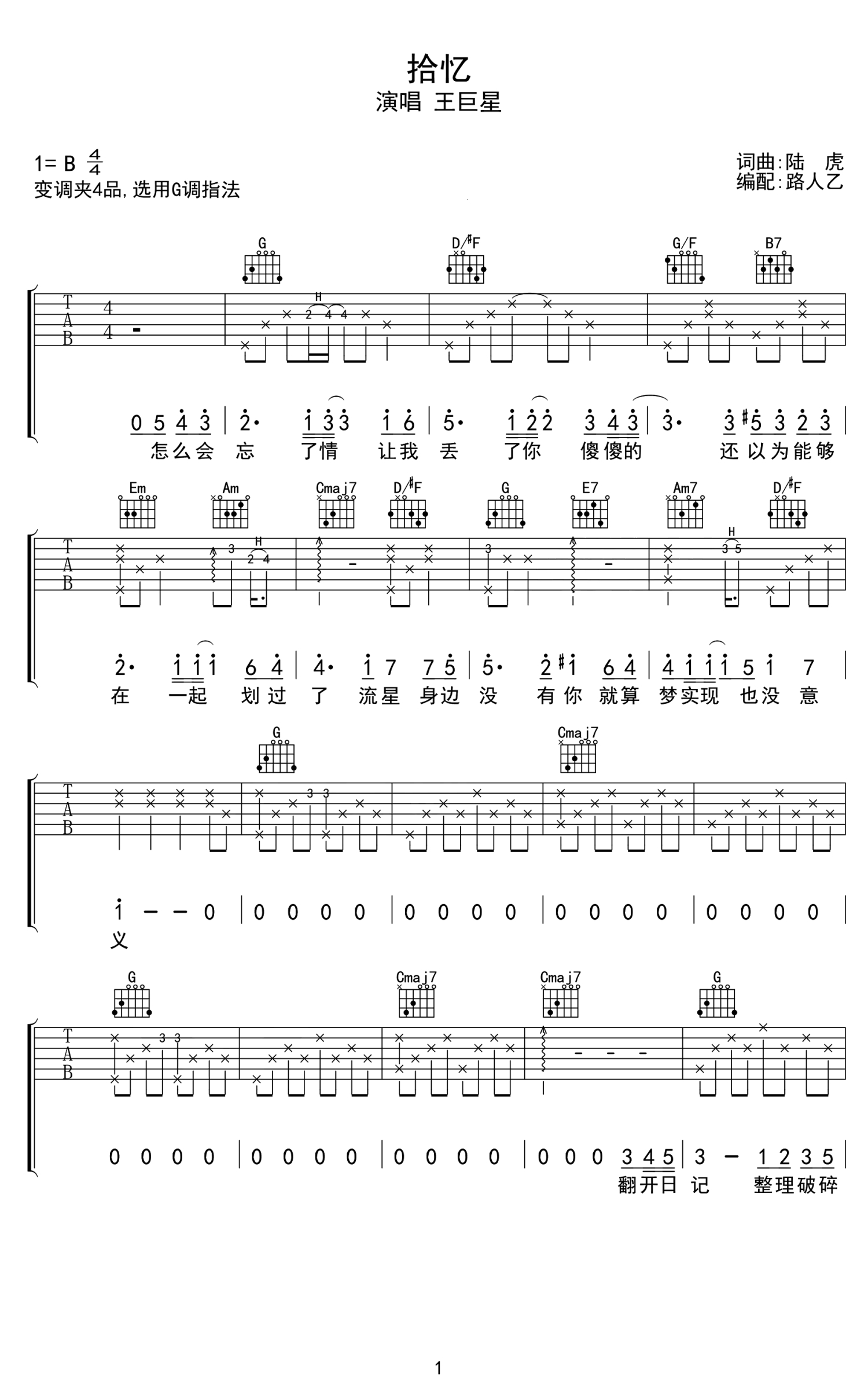 曲谱介绍: 王巨星《拾忆》吉他谱,一起去看流星雨主题曲,张翰原唱,拾忆六线谱,原调B,变调夹夹四品,选用G调指法 因为这部偶像剧剧当年难以预料地爆火,《拾忆》也成了这部剧中的经典代表插曲,一听到这首歌,相信很多人就会想起这部剧,一部剧加一首曲,包含了很多人那些年对爱情的所有幻想,浓浓的画面感和回忆,这首歌无比悲伤的曲风,让人忍不住有种想要落泪的感觉。