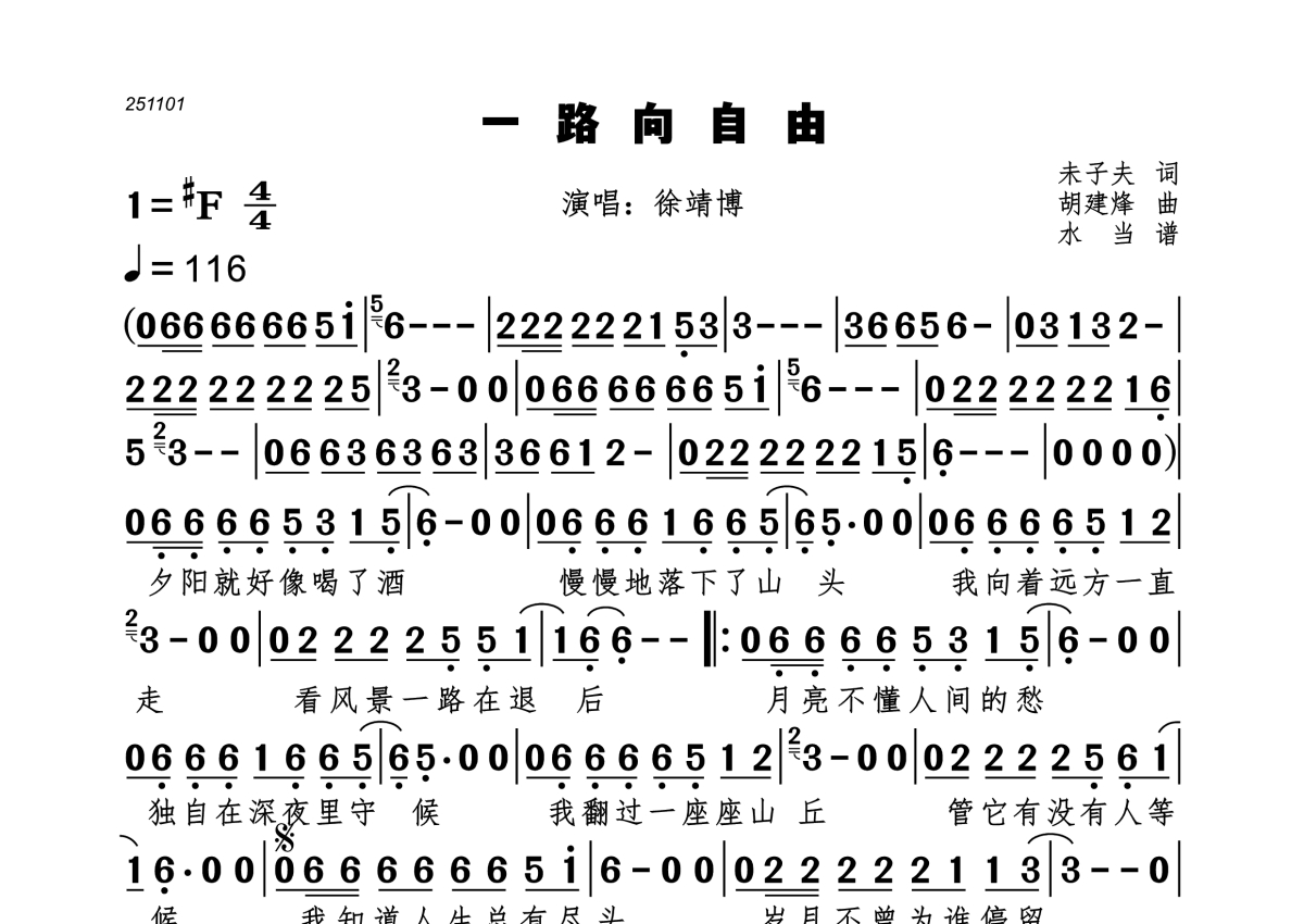 一路向自由简谱 - 徐靖博