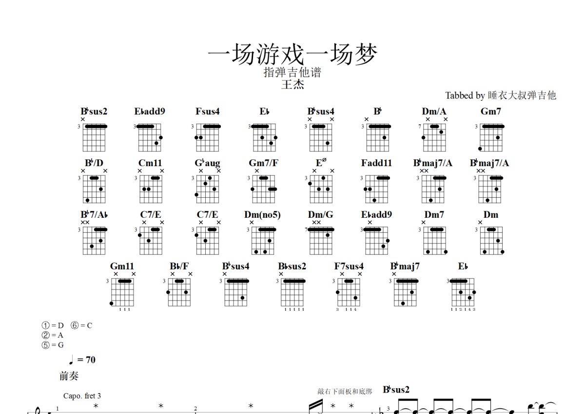 曲谱介绍: 王杰《一场游戏一场梦》吉他独奏谱,睡衣大叔弹吉他编配出品,共有6张高清图谱。