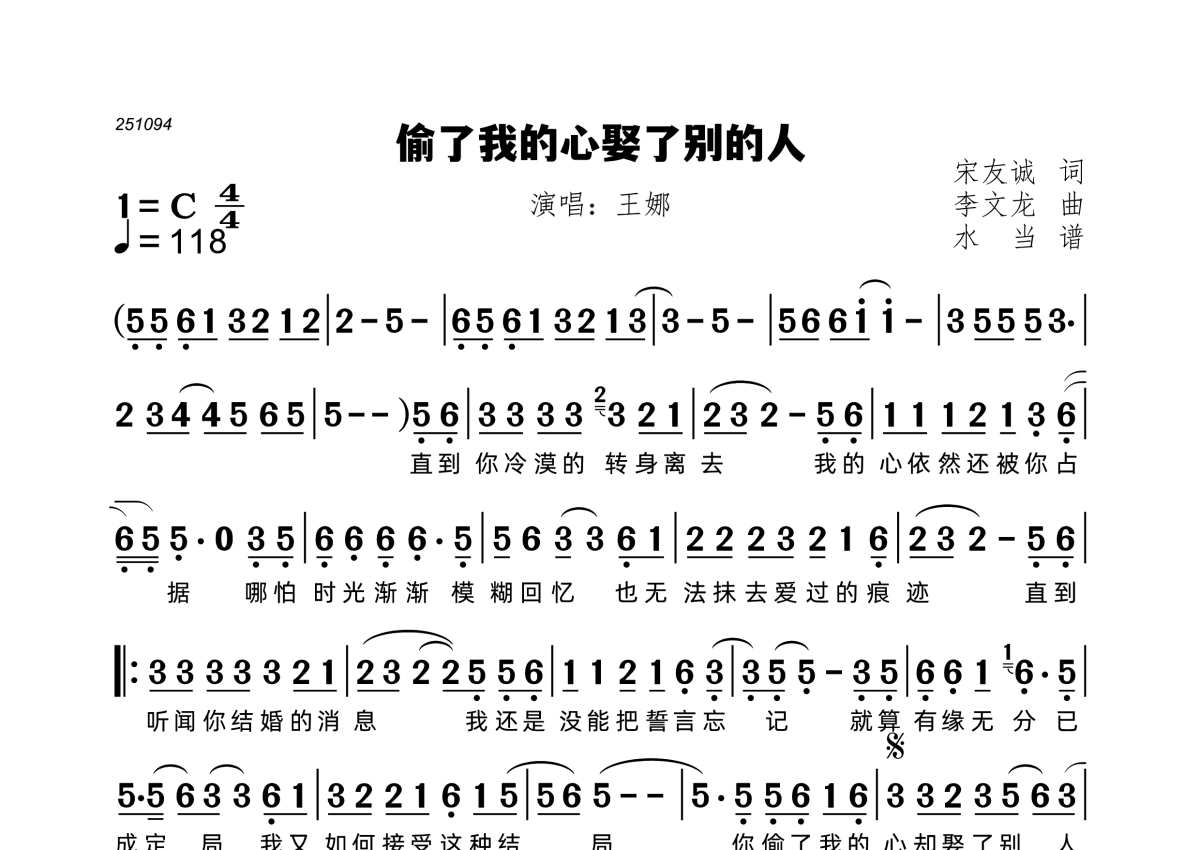 偷了我的心娶了别的人简谱 - 王娜