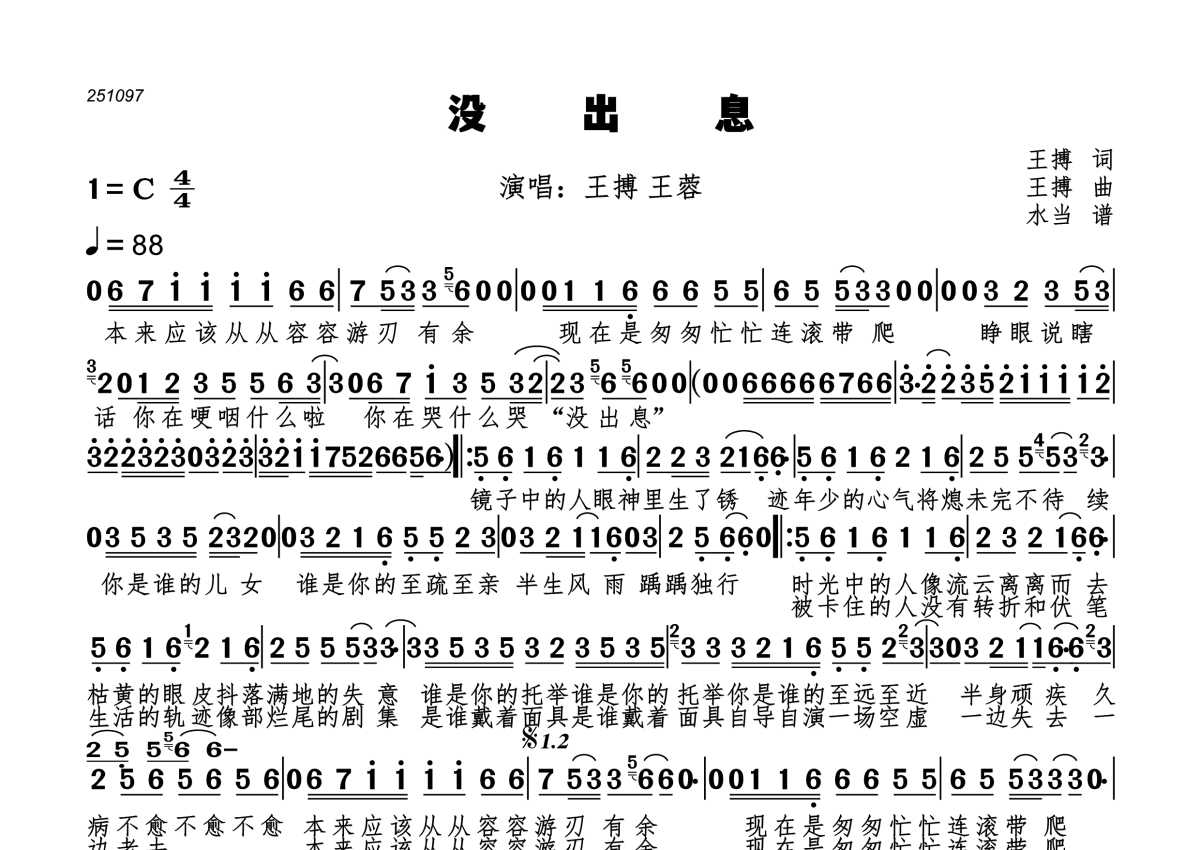 曲谱介绍: 王搏王蓉《没出息》,水当编配出品,共有1张高清图谱,免翻页排版设计。