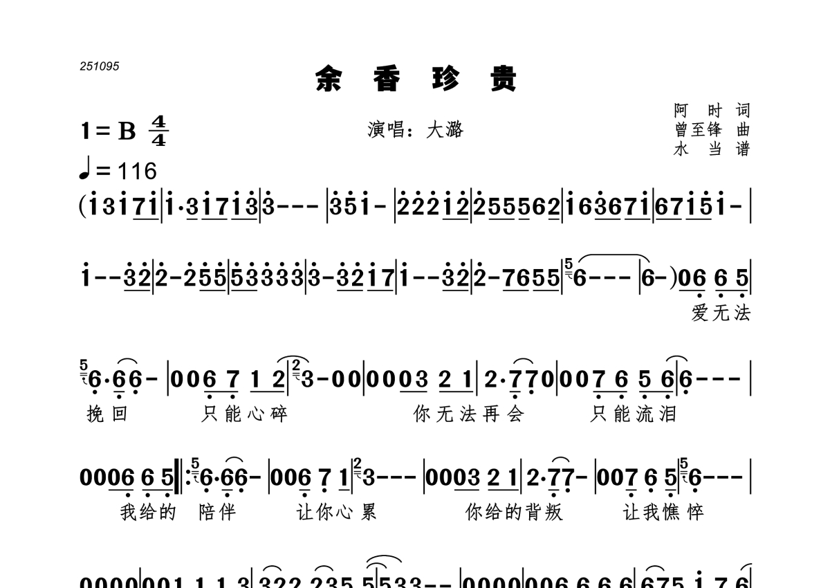 曲谱介绍: 大潞《余香珍贵》,水当编配出品,共有1张高清图谱,免翻页排版设计。