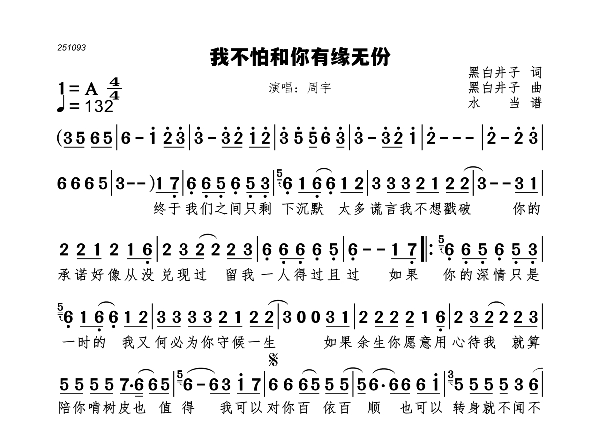 曲谱介绍: 周宇《我不怕和你有缘无份》,水当编配出品,共有1张高清图谱,免翻页排版设计。