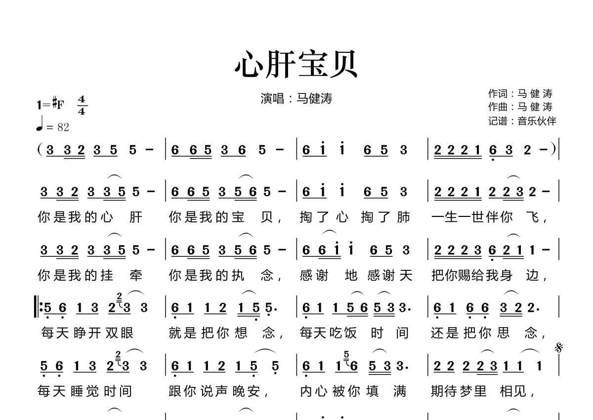 曲谱介绍: 马健涛《心肝宝贝》,音乐伙伴编配出品,共有1张高清图谱,免翻页排版设计。