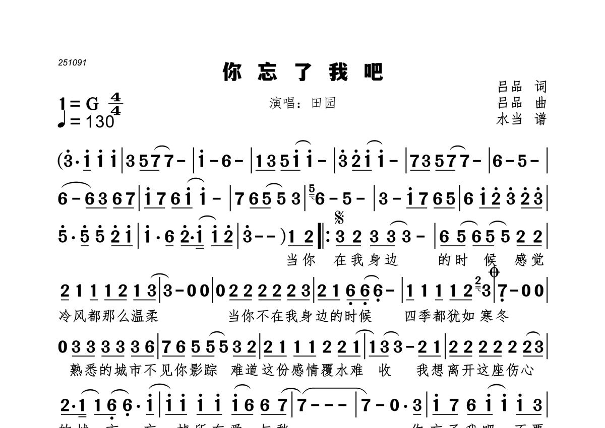 曲谱介绍: 田园《你忘了我吧》,水当编配出品,共有1张高清图谱,免翻页排版设计。