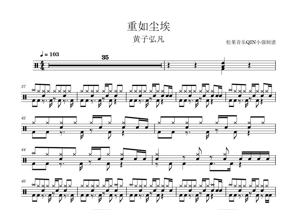 曲谱介绍: 黄子弘凡《重如尘埃》架子鼓谱,松果音乐QIN小强编配出品,共有2张高清图谱,免翻页排版设计。