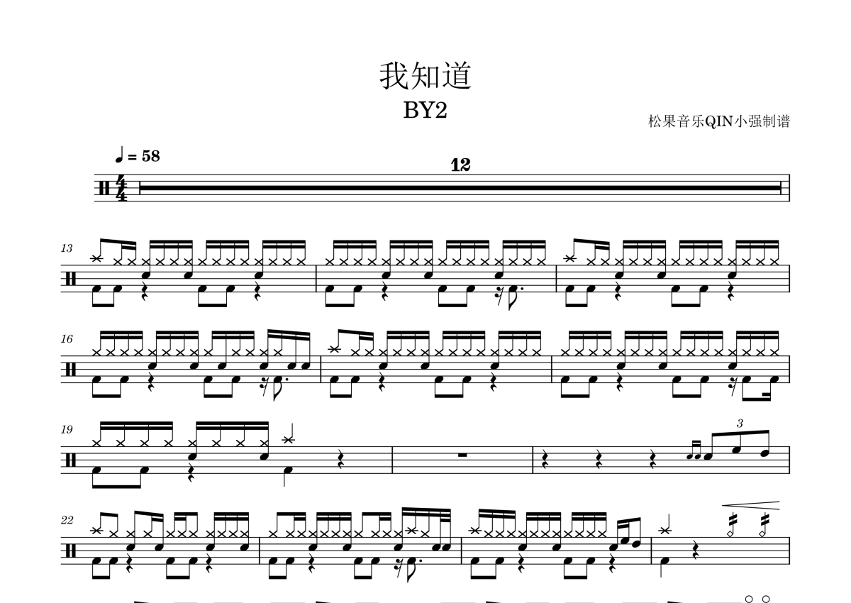 曲谱介绍: BY2《我知道》架子鼓谱,松果音乐QIN小强编配出品,共有2张高清图谱,免翻页排版设计。