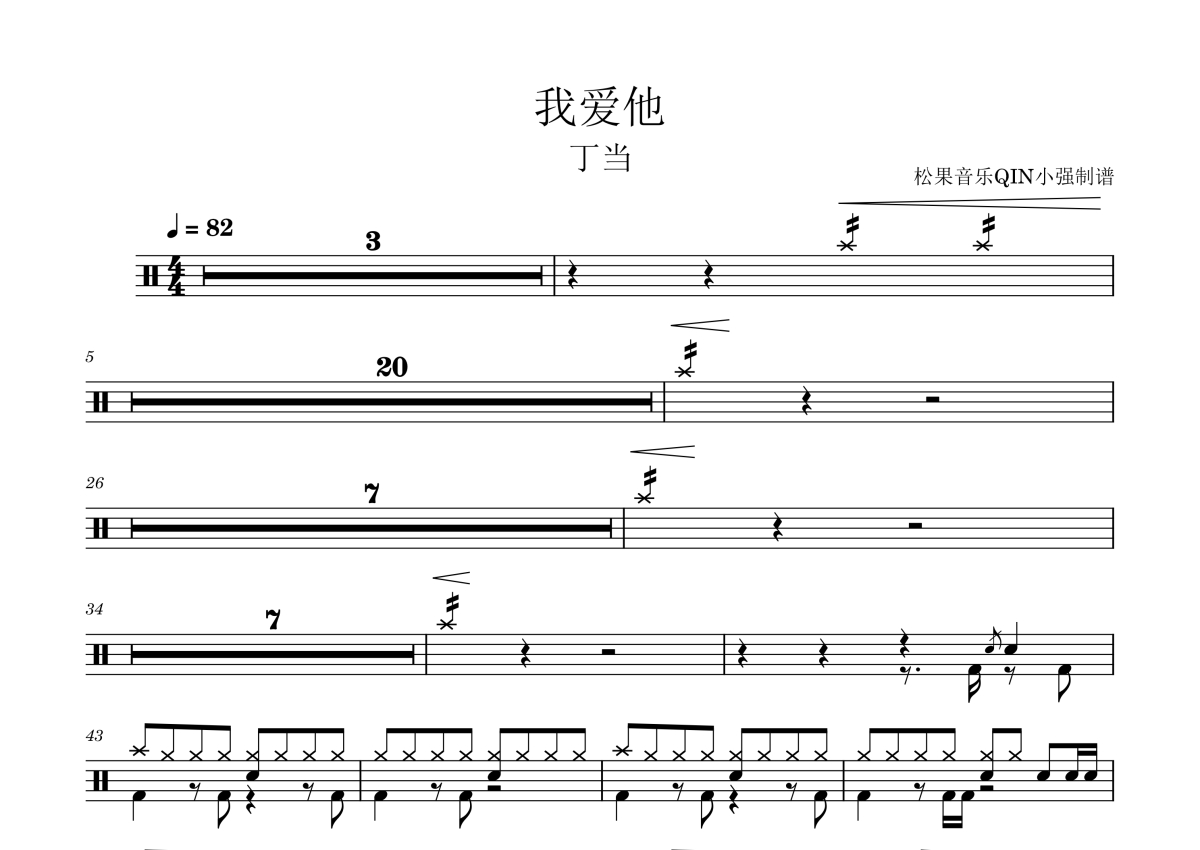 曲谱介绍: 丁当《我爱他》架子鼓谱,松果音乐QIN小强编配出品,共有2张高清图谱,免翻页排版设计。