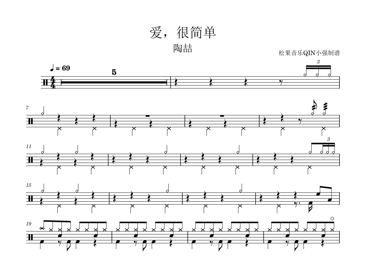 曲谱介绍: 陶喆《爱,很简单》架子鼓谱,松果音乐QIN小强编配出品,共有2张高清图谱,免翻页排版设计。