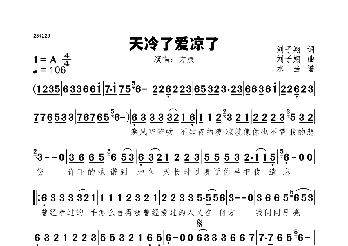 曲谱介绍: 方辰《天冷了爱凉了》,水当编配出品,共有1张高清图谱,免翻页排版设计。